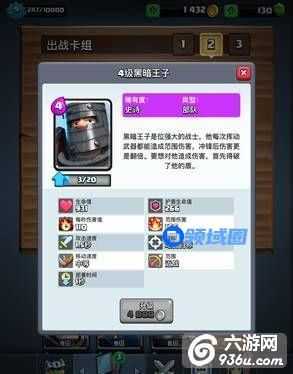 黑暗王子拥有和王子的类似属性,优秀的身材、良好的突击和防御能力,冲锋双倍伤害,中等的攻速和移动速度。黑暗王子虽然没有王子2.5的射程,但是附加了盾牌和群体伤害能力,同时费用只需要4费,大大提升了黑暗王子对各种局面的适应性。群体伤害弥补了王子害怕小单位的缺点,相对的伤害也有所降低,不过亏费的情况也少一些;盾牌具备生命值,在盾牌被摧毁之前黑暗王子的血量不会降低,简单说来就是及时盾牌只有1血,黑暗王子还能够承受2次以上的攻击,不要拿高伤害法术去攻击依然有盾牌的黑暗王子,所以黑暗王子面对高伤害慢速攻击时非常耐揍,坚实的盾牌和不错的血量让他成为了一个可靠的多面手,双王子共同冲锋的威胁不可小觑。相对于王子,黑暗王子的特性和费用让他略比王子优秀一些, 虽然单挑打不过王子,但是应对各种场面都能够较好发挥,不至于亏费,个人认为总体评级略高于王子。