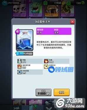 雷电法术作为大范围指向性法术,特殊性在于只攻击范围内3个生命值最高的目标,应用背景讲究,6费的消耗能否赚到费用,选择目标非常关键。大致计算一下对皇家塔的伤害值2费,雷电另外电死的2个单位超过4费就是赚的。其实雷电法术的应用主要是消灭关键目标和消磨皇家塔血量,比火箭更灵活,当然应用难度也更大。