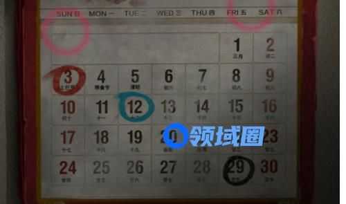 首先旁边日历的日期的圈圈有三种颜色,蓝色的圈“12”对应锁上的第一个颜色,红色的圈“03”对应锁上的第二个颜色,黑色的圈“29”对应着锁上的第三个颜色。