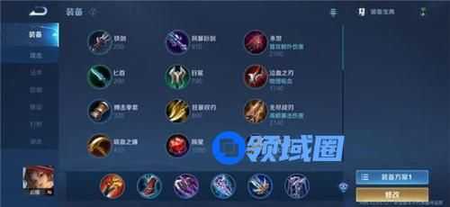 出装推荐:贪婪之噬(浴火之怒)+冷静之靴+暗影战斧+冰痕之握+破军(碎星锤)+魔女斗篷(名刀)
