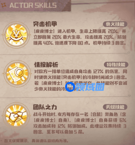 通过上面三点,想必大家应该都对对他有所了解了吧!皮皮博士的核心技能是突击机甲,在这里能够持续三回合的机甲能很高程度提升他的续航能力,战士没跑了!