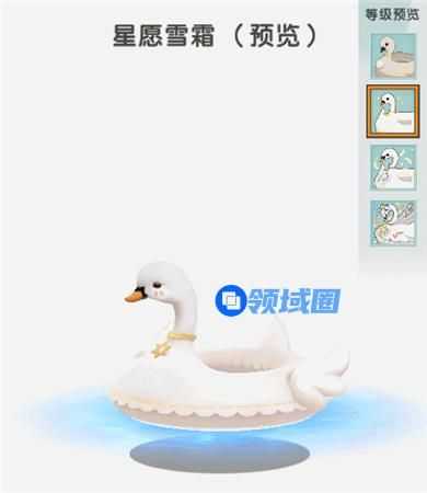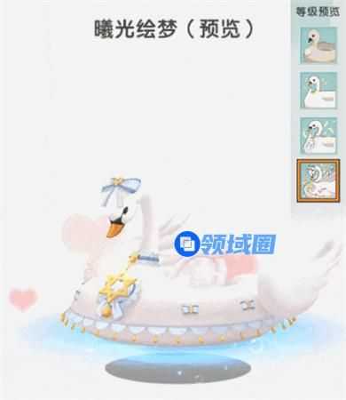 四级坐骑天鹅头上戴着浅蓝色的蝴蝶结、细长的脖子上系着特有的徽章,底部环绕着蓝色水的特效,空中飘落白色的羽毛、天鹅身上不断散发出粉色爱心的特效,既可爱又漂亮!