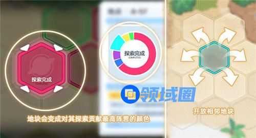 地块的探索进度达到100%后即为探索完成,地块会变成对其探索贡献最高阵营的颜色,同时会开放相邻的地块。