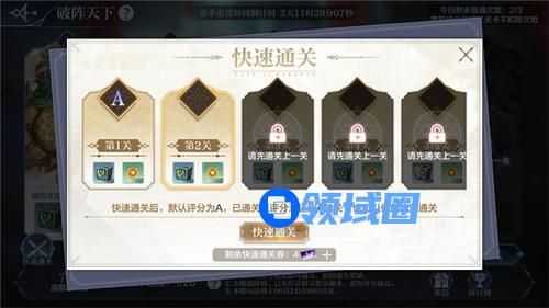 消耗“破阵天下速通券”即可速通破阵天下的关卡,速通后评分直达A级