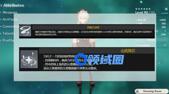 万叶2命时,释放元素爆发后,效果持续期间,万叶获得200精通,并且场上角色会获得额外的200精通(注:该效果无法叠加)。有些类似六命迪奥娜的大招元素精通增幅,不过没有那么多限制条件。