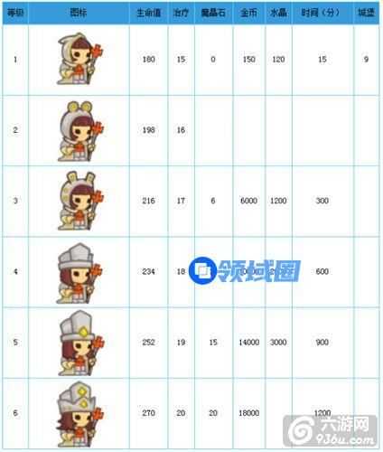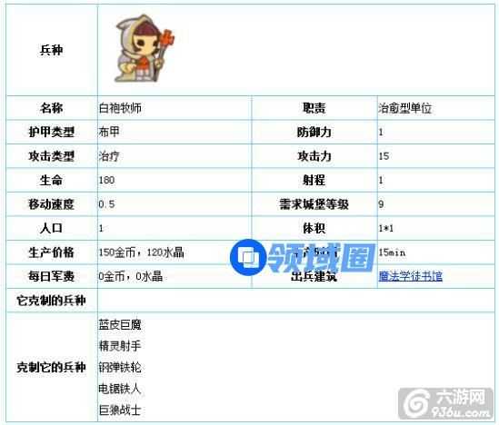 等级1的白袍牧师生命值180,给己方回血15,生产一个白袍牧师需要消耗150金币、120水晶,耗时15分钟。