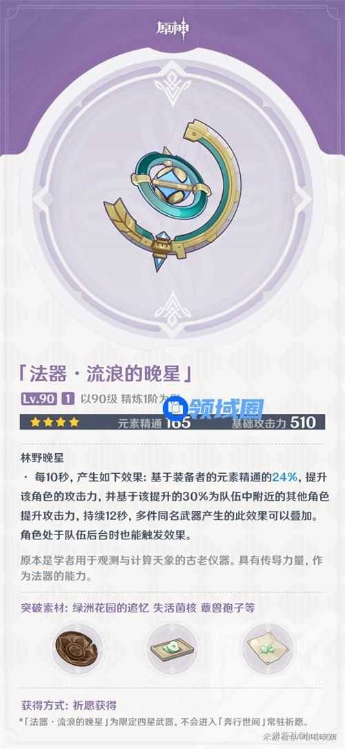 总而言之【流浪的晚星】是限定四星法球武器,只能通过官方不定时的up期间抽取。错过的玩家只能等官方的不定时武器卡池的返场复刻了。