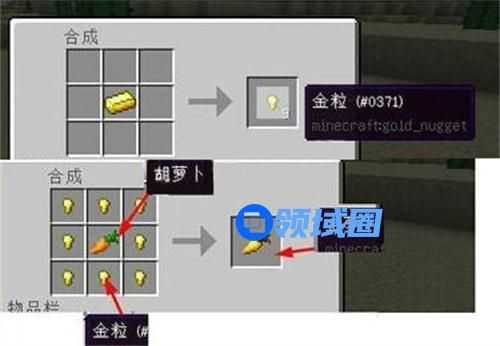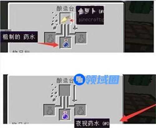 总之玩家可以收集萝卜和金矿,后再去使用金矿合成金粒,接着去制作一个粗制的药水,之后和成夜视药水后加入发酵蛛眼就可以合成隐身药水了。