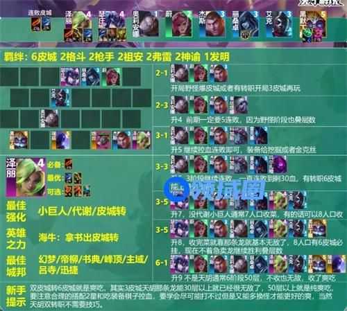 总之在皮城阵容一般是建议2-3前达成3皮城,如果没有那么不推荐玩,达成3皮城后一定要走连败攒霸王龙层数,并且开局的传说之力一定要选择海牛这样就可以开局有纹章之书,等着皮城转职就行。达成6皮后可以继续连败攒成熟达成50层以上后再去考虑收菜。