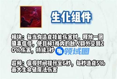模块:每当你造成技能伤害时,释放一团剧毒瘟疫,使目标1格内的敌人额外受到20%伤害,持续3秒