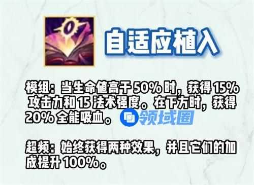 模组:当生命值高干50%时,获得15%攻击力和15法术强度。在下方时,获得20%全能吸血。