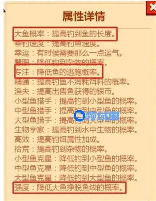 总之玩家在游戏当中我们钓鱼成功率就主要取决于这三个属性。这三个属性的提升优先级是:专注>强度>大鱼概率,把握这些属性就行了。