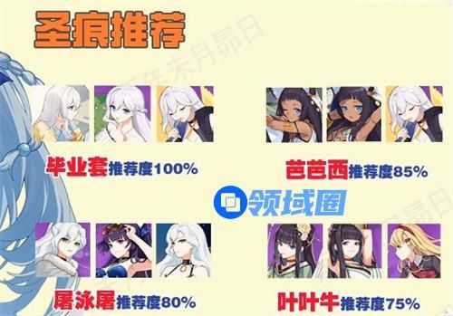 而圣痕的选择:塞西莉亚套有能力就抽,抽不出来也没事,带个猫猫的圣痕-芭芭西套装也可以用,当然万能的屠泳屠和叶叶牛也是很不错的选择。
