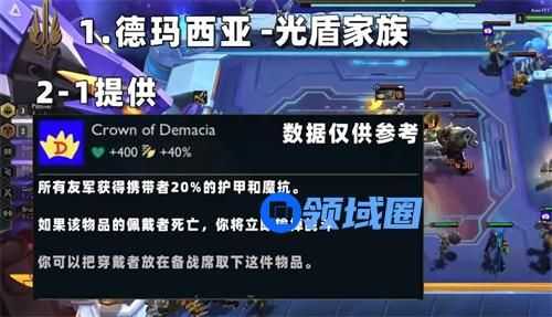 光盾家族:在2-1时提供一个“德玛西亚王冠”,王冠的效果是所有的队友获得王冠携带者20%的双抗
