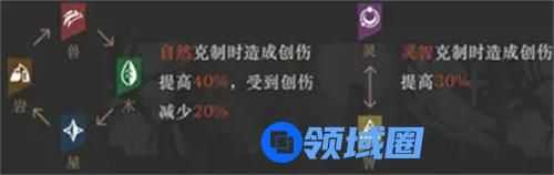 属性克制效果:前四种自然属性克制时造成的创伤提高40%,受到的创伤减少20%,灵智之间相互提高30%的伤害。