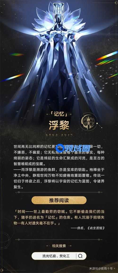 逆时而行的生物,执掌「终末」命途的星神。穿行于宙域之间的幽灵,喃喃宣布着必将实现的预言,和记忆星神正好相反的,简单理解就是,正常就是从生到死,它是从死到生,全是反过来的。