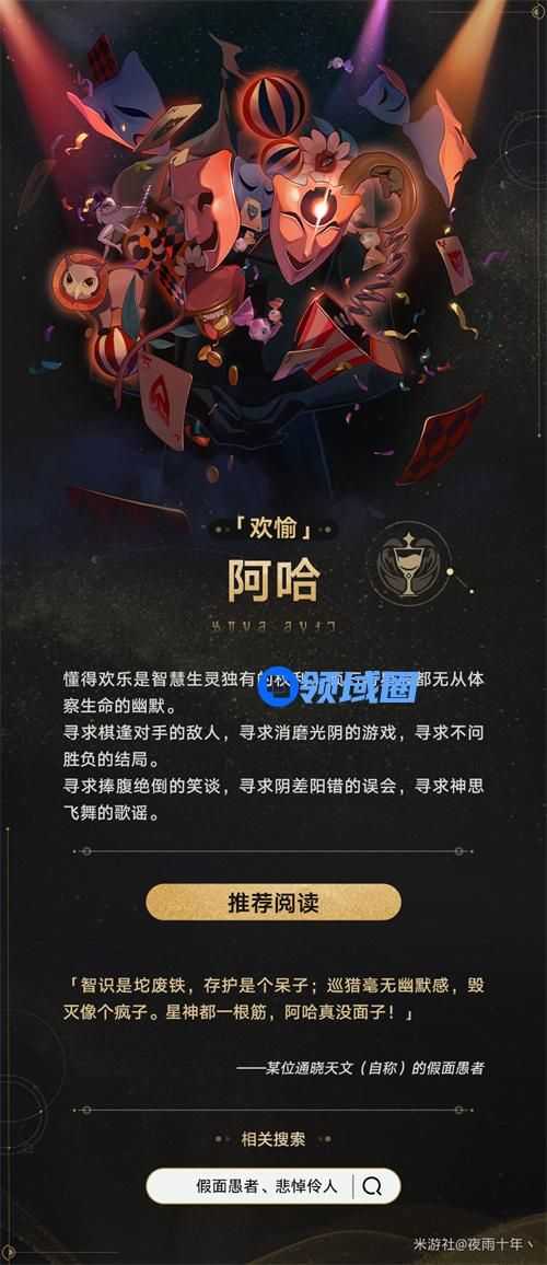 懂得欢乐是智慧生灵独有的权利。顽石与星辰都无从体察生命的幽默。寻求棋逢对手的敌人,寻求消磨光阴的游戏,寻求不问胜负的结局。寻求捧腹绝倒的笑谈,寻求阴差阳错的误会,寻求神思飞勺歌谣。曾经爬到过虚数之树的枝头了解宇宙真相后直接呆滞,直到听到婴儿的啼哭后笑了出来,于是就升格为-「欢愉星神」阿哈,可以说「欢愉」阿哈其实是真正对世间生命友好的星神之一,尊重一切乐子人。