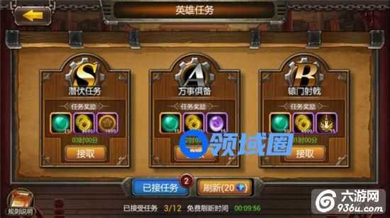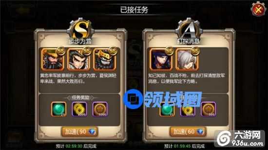 英雄任务共分为S、A、B三种,分别会耗时3小时、2小时、1小时,点击刷新可继续领取高级的任务。玩家领取其中一种人物后需要派遣一定数量的SS级武将出征,从而获得任务奖励。
