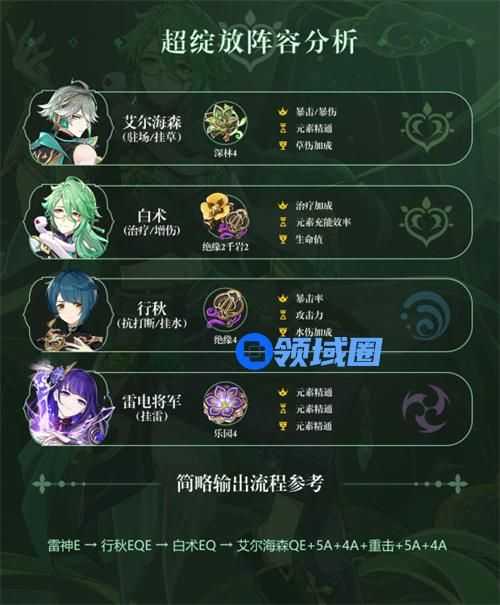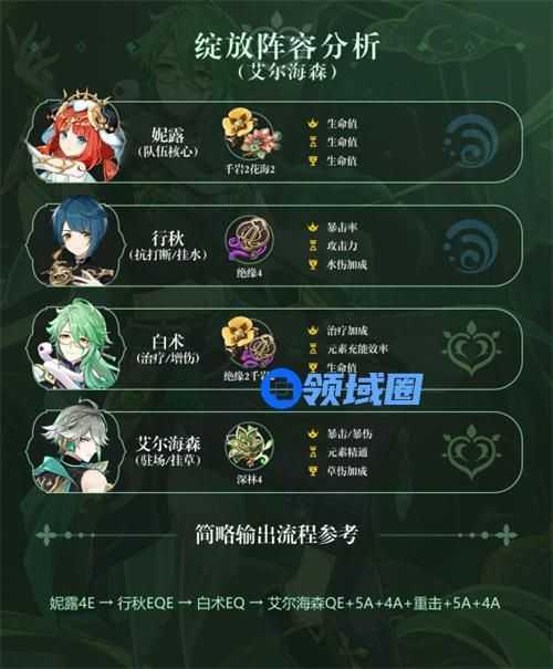 3、随着「白术」实装解决了生存位置冲突问题后,作为万能插件的「艾尔海森」也能够融入妮绽体系了,他的输出轴与「白术」技能持续时间完美吻合。「艾尔海森」拥有最高的前台挂草频率,配合「行秋」的高频挂水和抗打断,获得极致的产种效率和输出手感,有效解决了妮绽对单薄弱的问题。「行秋」是主要的草原核触发者,他的配装与「绫人」同理,精通和直伤套装都可以使用,整体差距不大。该组合最大的优势莫过于解放了热门辅助「纳西妲」。