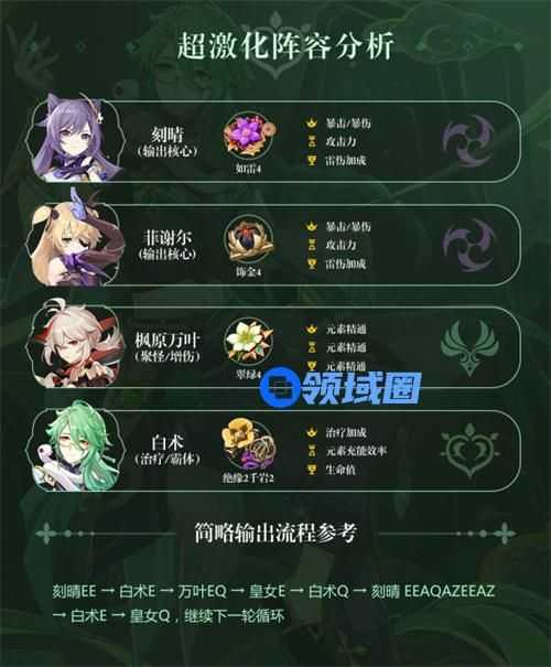 总之白术的配队主要是根据被动的加伤效果来定的,所以一般就只有原绽放队伍,超绽放队伍,超激绽队伍,超激化队伍这四种主流配队,燃烧和烈绽放并不适合白术。