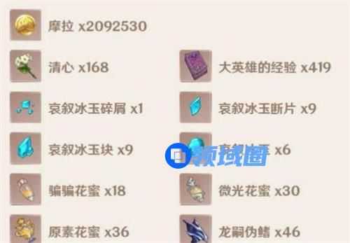 申鹤升级材料:摩拉×2092530、清心×168、大英雄的经验×419、哀叙冰玉断片×9、哀叙冰玉碎屑x1、哀叙冰玉块×9、哀叙冰玉×6、骗骗花蜜×18、微光花蜜×30、原素花蜜×36、龙嗣伪鳍×46、