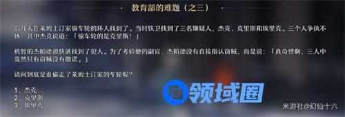 教育部的难题是崩坏星穹铁道游戏的推理系列,有很多道题目,这些问题确实是需要我们思考一下时间才能自己解开的,为了方便大家,小编今天就给大家把答案整理出来了,希望能帮助到各位玩家。