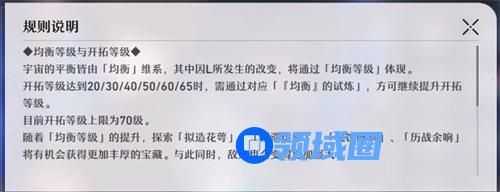 均衡等级提升方法:均衡等级是我们需要达成20/30/40/50/60/65的开拓等级后,并且完成对应的主线任务进度后就会触发【均衡试炼】,我们通关均衡试炼后就会提升对应的均衡等级了。