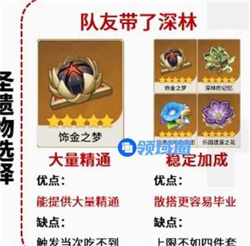 分析:饰金之梦是最契合并且也是最万能的艾尔海森圣遗物,不管是玩家是超激化队伍,还是种门的绽放队,艾尔海森都可以使用饰金之梦套装,但使用饰金之梦的话就需要队友带草套减抗了。