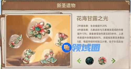 正如该套圣遗物的名字那样,【花海甘露之光】—— 又名花神套,2件套的生命值提升与套装的受伤叠加元素战技与元素爆发伤害的buff,恰好贴合妮露的角色特性,