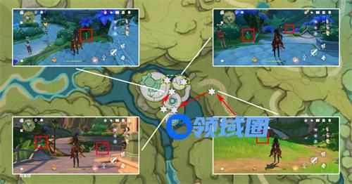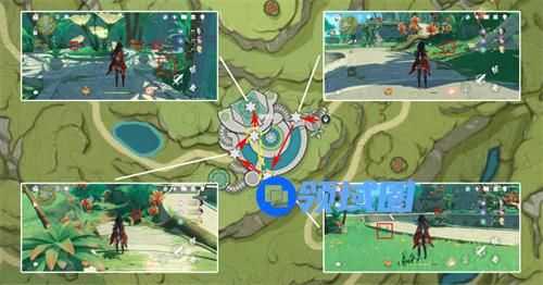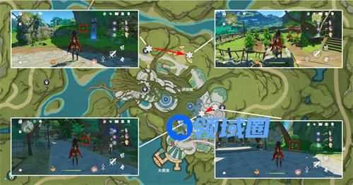 须弥城四个采集点如上,位置都比较好找。右下位置位于三十人团驻地(须弥声望)大门右侧,可以通过传送点直接飞下来