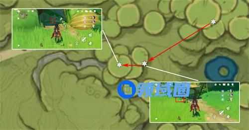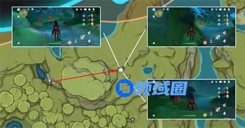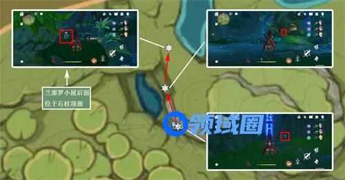 须弥城东南传送点为起点。二号点位位于须弥城入口左侧高地上,三号点位最下层的码头附近,可通过码头附近传送点过去。