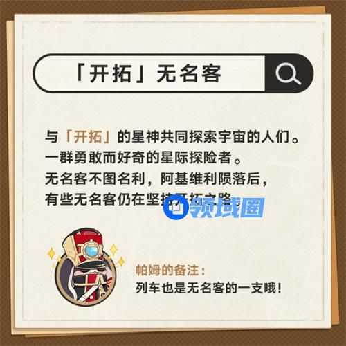 1、「开拓」无名客。与「开拓]的星神共同探索宇宙的人们。一群勇敢而好奇的星际探险者。无名客不图名利,阿基维利陨落后,有些无名客仍在坚持开拓之路。【主角团也是其中之一,星穹铁道】