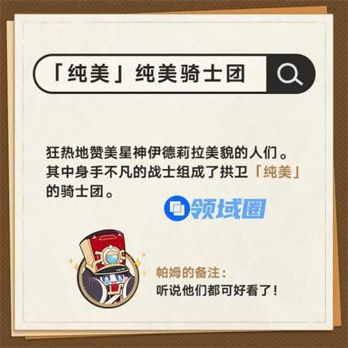 2、「纯美」纯美骑士团。狂热地赞美星神伊德莉拉美貌的人们。其中身手不凡的战士组成了拱卫「纯美」的骑士团。
