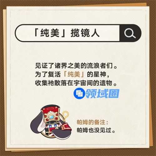 3、「纯美」揽镜人。见证了诸界之美的流浪者们。为了复活「纯美]的星神,收集他散落在宇宙间的遗物。