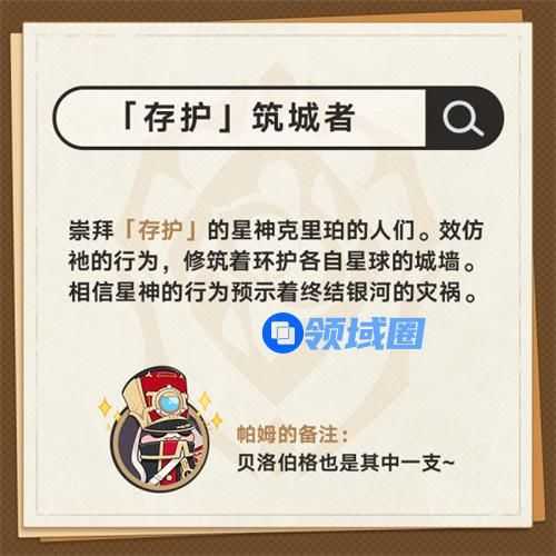 5、「存护」筑城者。崇拜「存护]的星神克里珀的人们。效仿社的行为,修筑着环护各自星球的城墙。相信星神的行为预示着终结银河的灾祸。