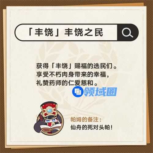 7、「丰饶」丰饶之民。获得「丰饶」赐福的选民们。享受不朽肉身带来的幸福,礼赞药师的仁爱慈和。