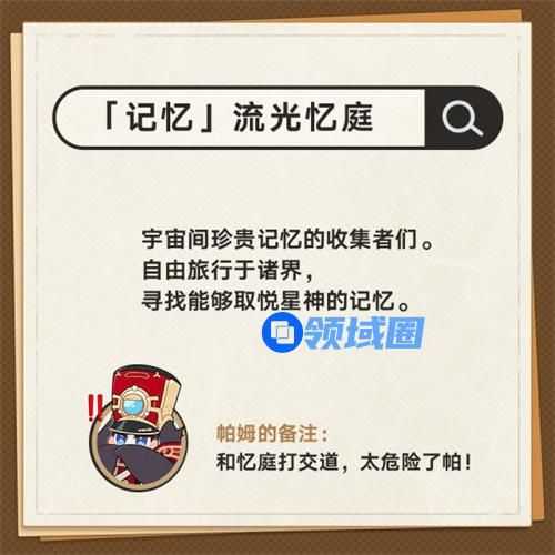 12、「记忆」流光忆庭。宇宙间珍贵记忆的收集者们。自由旅行于诸界,寻找能够取悦星神的记忆。