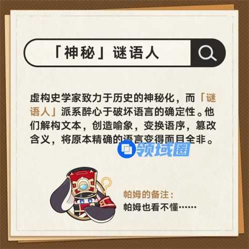 14、「神秘」谜语人。虚构史学家致力于历史的神秘化,而「谜语人」派系醉心于破坏语言的确定性。他们解构文本,创造喻象,变换语序,篡改含义,将原本精确的语言变得面目全非。