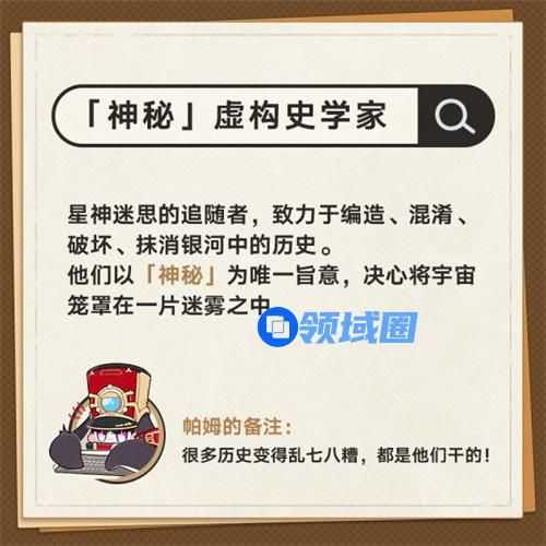 15、「神秘」虚构史学家。星神迷思的追随者,致力于编造、混淆、破坏、抹消银河中的历史。他们以「神秘」为唯一旨意,决心将宇宙笼罩在一片迷雾之中。