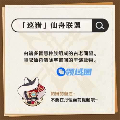 19、「巡猎」仙舟联盟。由诸多智慧种族组成的古老同盟。驱驭仙舟清除宇宙间的丰饶孽物。