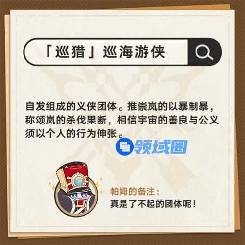 20、「巡猎」巡海游侠。自发组成的义侠团体。推崇岚的以暴制暴,称颂岚的杀伐果断,相信宇宙的善良与公义须以个人的行为伸张。