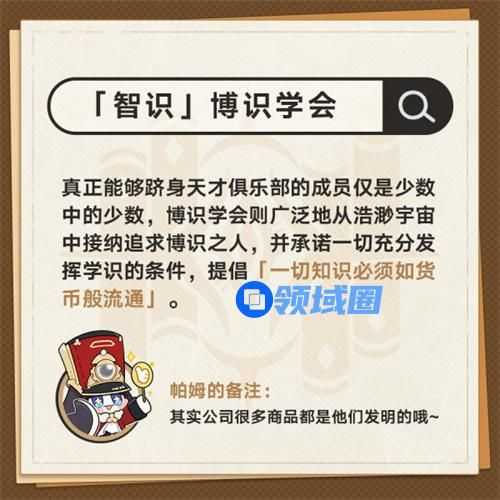 21、「智识」博识学会。真正能够跻身天才俱乐部的成员仅是少数中的少数,博识学会则广泛地从浩渺宇宙中接纳追求博识之人,并承诺一切充分发挥学识的条件,提倡「一切知识必须如货币般流通」。