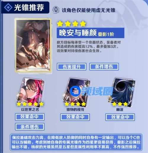 4、【幽邃】可以让佩拉在起手三回合获得效果命中加成,可以作为佩拉的过渡光锥使用,在战斗时间较长的环境下不推荐。