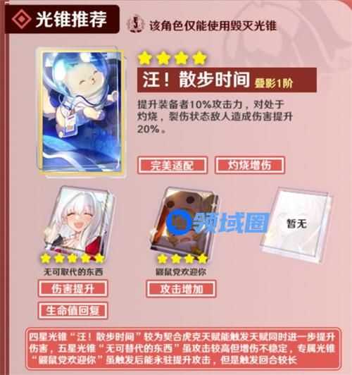 总之以上就是关于游戏当中虎克的光锥推荐了,所以小编也是建议玩家可以使用四星的【汪!散步时间】,因为它是最契合虎克机制的光锥。