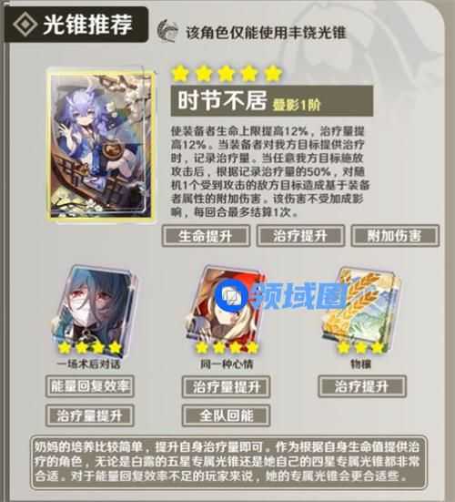 总之娜塔莎的光锥推荐就是,时节不居、一场术后的对话、同一种心情、物穰。其中如果新手玩家没有好用的四星光锥那么可以使用三星的【物穰】作为过渡。