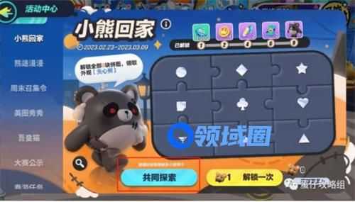 通过共同探索分享至第三方平台完成好友助力任务的途径获取5块小熊饼干,再完成【熊途漫漫】中的成就任务获取剩下的4块小熊饼干,登录三天即可解锁所有拼图领取失心熊盲盒外观。