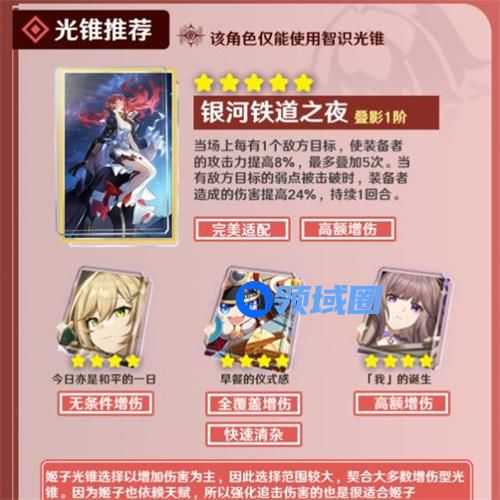 【银河铁道之夜】:这个光锥是姬子的专属光锥,它可以让姬子在面对多个敌人时获得高额攻击力加成且在敌人弱点被击破时姬子还会获得高额增伤,十分利好偏向于对群的姬子且与姬子的天赋联动效果极好。