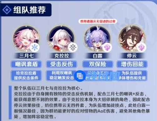 停云不仅可以帮助克拉拉恢复能量,还可以为克拉拉提供攻击力加成,提升输出效率,白露则是队伍的双保险,保证全队的状态健康,装备云无四件套还可以为队伍提供战技点。