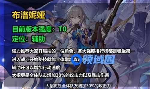 目前版本强度T0,定位辅助,强力推荐大家开局抽的一位角色,各大强度排行榜都是稳坐第一。进入战斗开始秘技就能全体增加攻击力,辅助还可以增加行动速度,大招更是全体队友增加30%的攻击力以及暴击伤害。