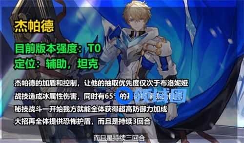 目前版本强度T0,定位辅助,坦克杰帕德的加顿和控制,让他的抽取优先度仅次于布洛尼亚,战技造成冰属性伤害,同时有65%的基础概率冻结目标,密技战斗一开始我方就能全体获得超高防御力加成,大招在全体提供恐怖护盾,而且是持续3回合。